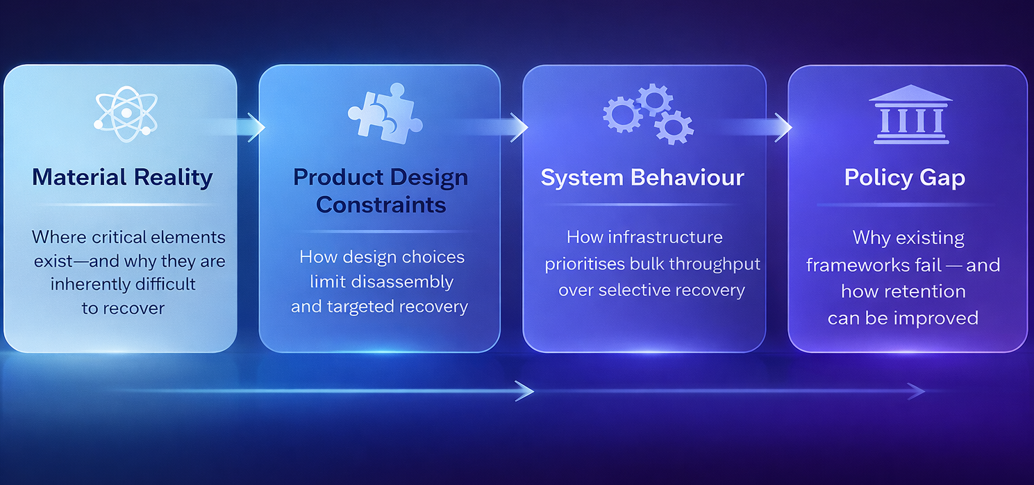 This led to a reframing of the problem from improving recycling performance, to redesigning systems for material retention. It highlights that increasing recycling rates alone will not secure critical material supply, particularly for high-value, low-concentration elements that are not captured by conventional processes.